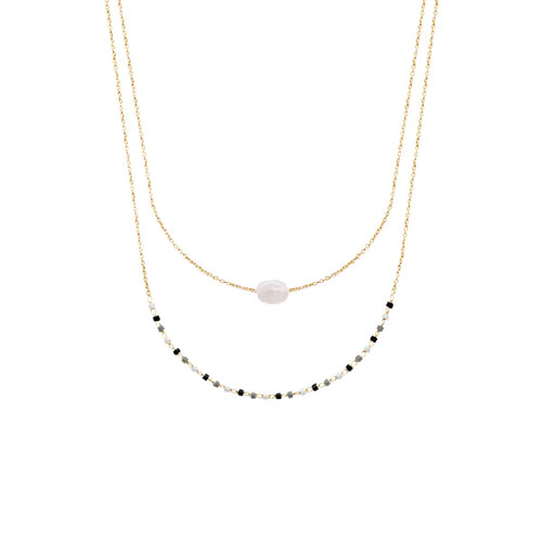 Mystigrey Girls and Women Agatha 18K Plated Gold Double Necklace Gold Black Agate, Blue Amazonite, Pink Quartz, Green Aventurine and White Moonstone
